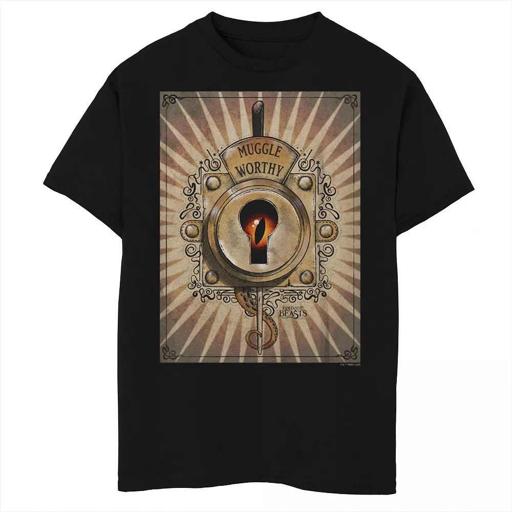 He’ll love his look in this Boys 8-20 Harry Potter Fantastic Beasts: The Crimes of Grindelwald Muggle Worthy Keyhole With Beast Eye Peeking Through Graphic Tee.