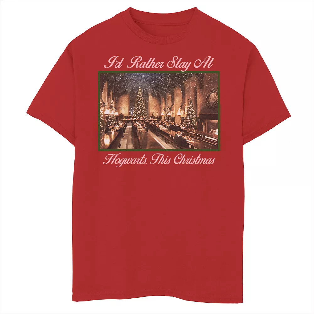 He’ll love showing off his favorite franchise with this boys’ Harry Potter I’d Rather Stay At Hogwarts This Christmas Graphic Tee.
