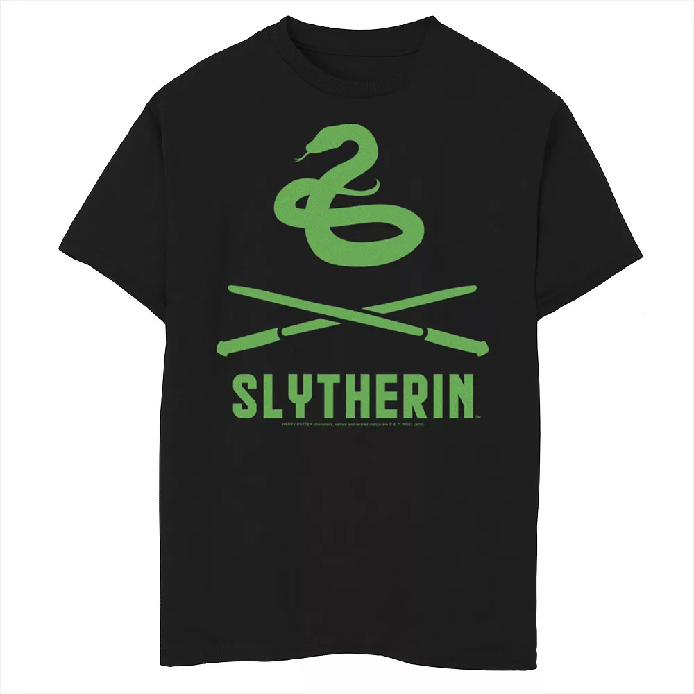 He’ll love showing off this boys’ Harry Potter Slytherin Crossed Wands Logo Graphic Tee.