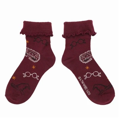Experience the magic of Harry Potter with this enchanting 3-pair set of women’s quarter crew socks. Featuring the Hogwarts crest, a Hogwarts letter, and Harry’s iconic glasses in shades of white and maroon, these socks add a touch of wizarding charm to your outfit. The fold-over cuffs with lettuce edges add a playful and stylish detail to these cozy socks. Made with a polyester-spandex blend, they offer a comfortable fit for sock sizes 9-11 and shoe sizes 5-10. These officially licensed socks are thoughtfully designed with high-quality materials for durability and comfort. Machine washable on cold with like colors and tumble dry on low heat for easy care. Step into the magical world of Harry Potter with these custom-designed socks, a must-have for any fan’s wardrobe.