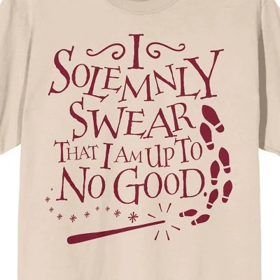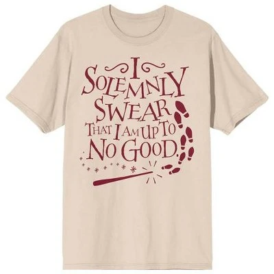 - CUSTOM DESIGN: A wand and a set of red footprints appear underneath red text that reads, “I Solemnly Swear That I Am Up To No Good,” in the graphic design on this tee. Fans of the Harry Potter series will love this fun design.