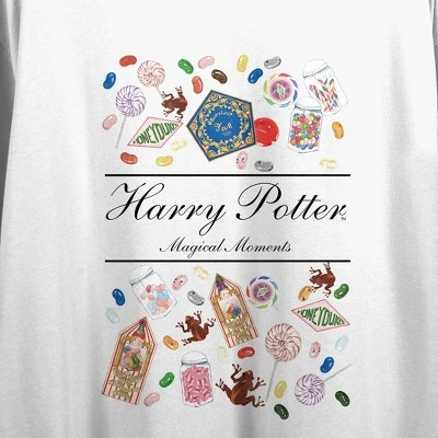 - CUSTOM DESIGN: Images of a wizard card and Bertie Bott’s Beans along with other icons from the series decorate this graphic tee while black letters in the center read, “Harry Potter Magical Moments.” Harry Potter fans will love this fun design.