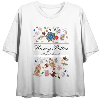 Celebrate your favorite magical series with this Harry Potter crop t-shirt. The shirt features an image of a wizard card surrounded by Bertie Bott’s Beans and other icons from the series while black letters in the center of the image spell out, “Harry Potter Magical Moments.” The tee comes in a white short sleeve crew neck. Fans of the Harry Potter books and movies will love this comfy crop tee.