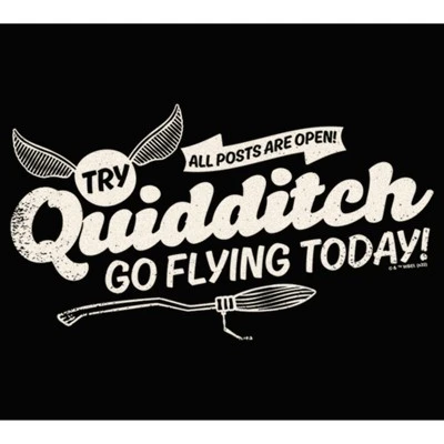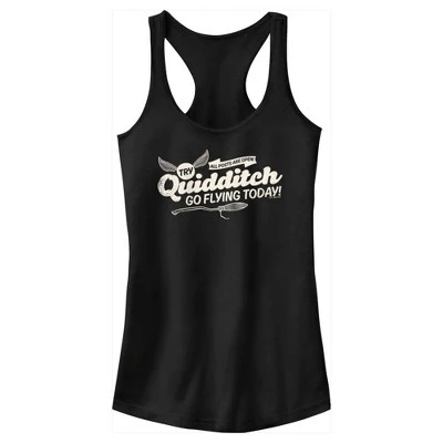 - Strut your stuff with this stylish juniors’ racerback tank top featuring a cool graphic of the phrase “Try Quidditch go flying today!” printed across the front along with the Golden Snitch and a magic Nimbus!