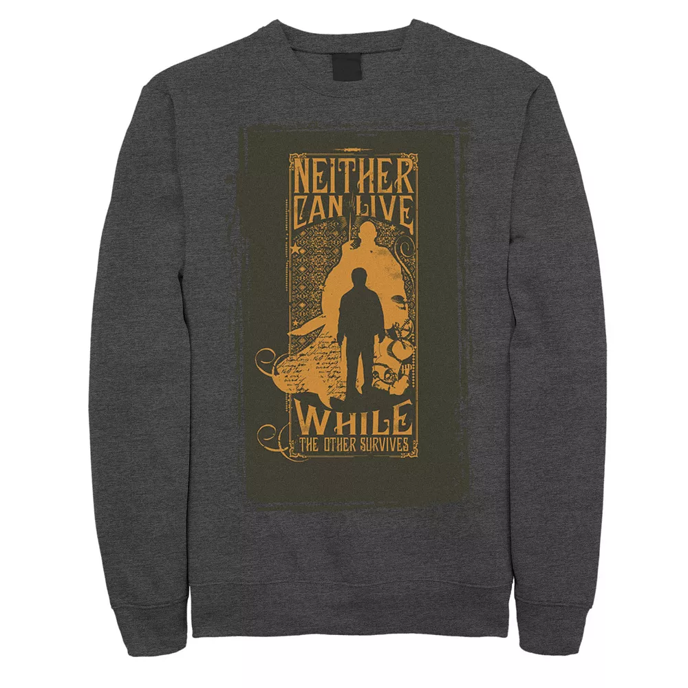 He’ll love the look of this Men’s Harry Potter Neither Can Live While The Other Survives Quote Fleece Graphic Pullover.