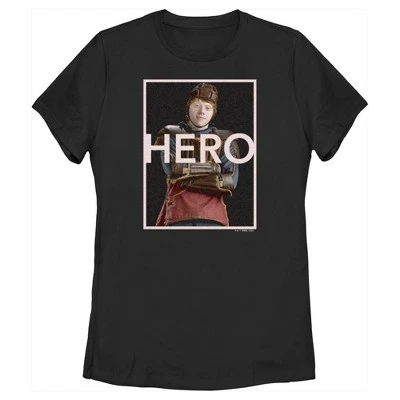 - Strut your stuff with this stylish women’s t-shirt featuring a fun portrait of Ron Weasley with the word “Hero” printed across the front!